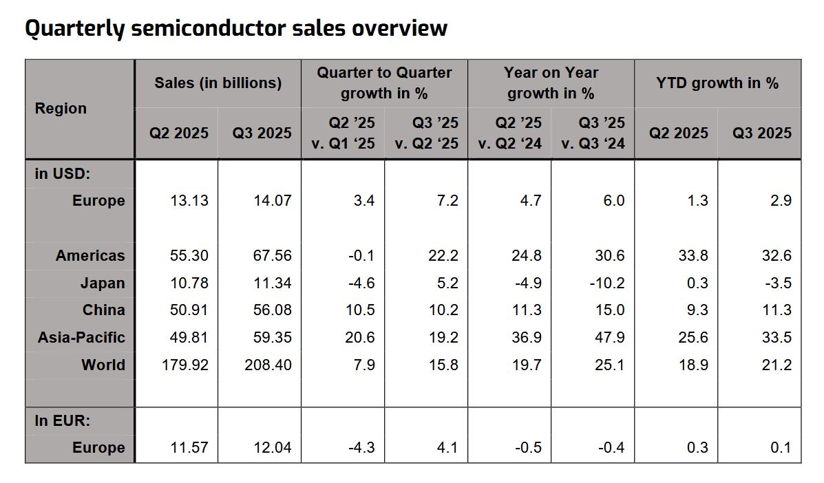 A l’échelle mondiale, toutes les régions ont enregistré une hausse des ventes de puces au 3e trimestre, totalisant ainsi 208,4Md$. D’ailleurs, en glissement annuel, les ventes mondiales ont progressé de 25,1% au cours de cet avant-dernier trimestre 2025.