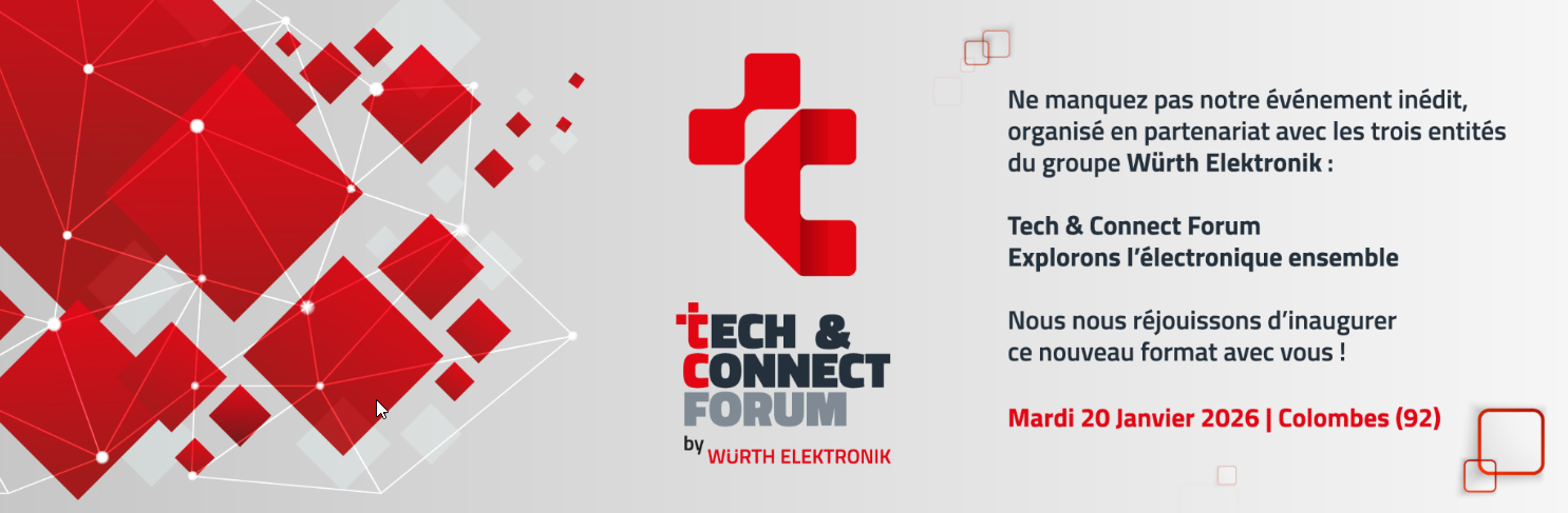 C’est une première pour le groupe Würth Elektronik : ses trois entités, à savoir Composants, Circuits Imprimés et Systèmes Intelligents, ainsi que leurs partenaires (le Tech & Connect Forum by Würth Elektronik) organisent l’événement Tech & Connect Forum, Explorons l’électronique ensemble. Il se déroulera le mardi 20 janvier de 9h à 17h30 à l’Hôtel Kopster Colombes, au 65, rue Germaine Tillion, à Colombes (Hauts-de-Seine).