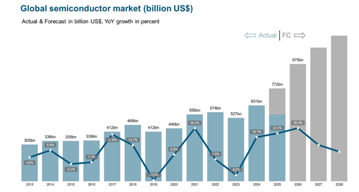 Concernant les perspectives 2026, elles frôlent les 1000Md$. Le WSTS prévoit des ventes qui devraient s’élever à 975,5Md$, soit +26%. Pour rappel, les experts avaient pronostiqué des recettes mondiales de 1000Md$ à l’horizon 2030. Peut-être atteindront-elles ce palier plus tôt que prévu si elles continuent de suivre cette dynamique ?