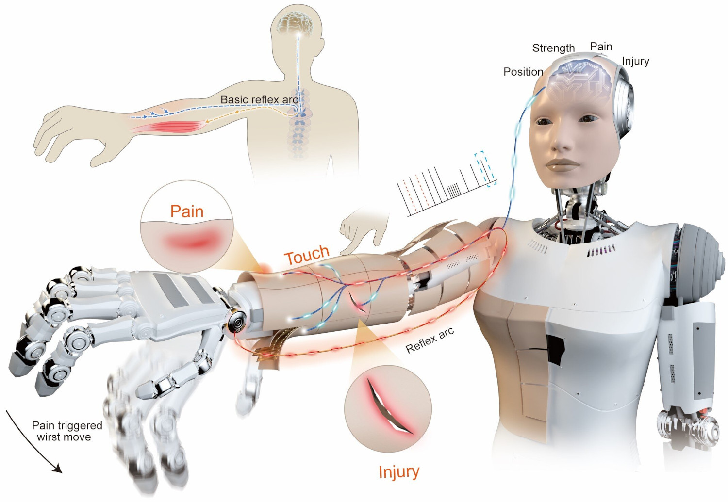 Dans ce contexte, des chercheurs de l’Université municipale de Hong Kong ont développé une peau électronique robotique neuromorphique (NRE skin), qui intègre des fonctionnalités avancées telles que la détection active de la douleur. Un robot doté de cette peau peut ainsi réagir aux stimuli tactiles et déclencher un réflexe de protection si nécessaire.