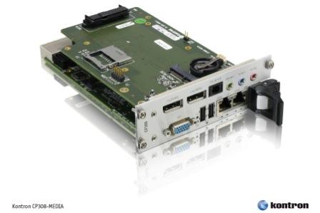 La carte CP308 est dotée de la carte d’extension CP308-Media (voir photo) qui route deux interfaces DisplayPort accessibles en face avant. Selon Kontron, face aux traditionnels DVI et LVDS, l’usage de la technologie DisplayPort réduit la taille des câblages et de la connectique tout en minimisant le recours à des composants électroniques supplémentaires pour le contrôle des écrans. La carte CP308-Media dispose également de connecteurs COM et SATA et d’emplacements SD/SDHC, CompactFlash et Mini PCI Express.