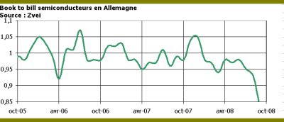 En Allemagne, selon les chiffres qui viennent d’être publiés par le syndicat professionnel Zvei, les ventes de semiconducteurs ont diminué (en dollars) de 5% au mois d’octobre comparé au mois précédent (-7% sur un