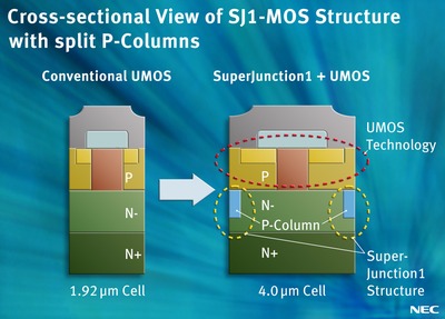 Par rapport à la structure UMOS-4 en tranchée, SJ1 induit une charge de grille et une capacité d’entrée réduites de quelque 40 %, tout en conservant une faible résistance à l’état passant.