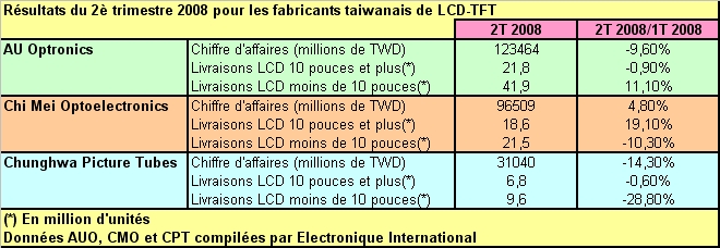 Dans un climat actuel plus que morose (forte baisse des prix, demande poussive, manque de visibilité…), les trois principaux fabricants taïwanais de LCD-TFT viennent d’annoncer leurs résultats concernant le deuxième trimestre 2008. Et à