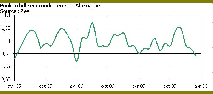 Au mois d’avril 2008, selon les données du syndicat professionnel allemand Zvei, les facturations de semiconducteurs ont baissé Outre-Rhin de 16% comparé à celles d’avril 2007. Elles sont aussi inférieures à ce qu’elles étaient au