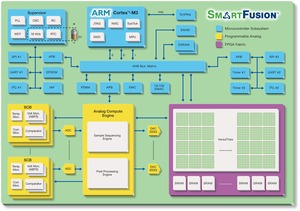 Héritière des premiers FPGA Fusion à signaux mixtes inaugurés en 2005, la famille SmartFusion a musclé sa partie processeur en implantant une version en dur du cœur Cortex-M3 et l’a orientée microcontrôleur en l’entourant de périphériques standards. Concernant l’aspect FPGA, la complexité des matrices s’échelonne de 60K à 500K portes système et le nombre d’E/S peut atteindre 204. Selon la société, la fréquence de fonctionnement est de 350 MHz. La technologie de programmation est le procédé flash d’Actel. Il permet d’obtenir des FPGA denses, de faible consommation, non volatils et reprogrammables dans le système.