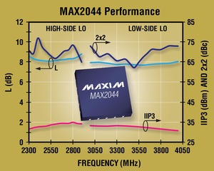 Bénéficiant d’une technologie SiGe, le MAX2044 affiche d’excellentes performances, tant en linéarité qu’en bruit. Ainsi, typiquement, il présente un point d’interception du troisième ordre (IIP3) de +32,5 dBm à l’entrée et un point de compression à 1 dB de +21 dBm. Par ailleurs son facteur de bruit est de 8,5 dB, alors que les pertes de conversion sont de 7,7 ]dB. Avec une puissance RF de -10 dBm, la fréquence parasite 2RF – 2OL est quant à elle rejetée à 68 dBc.