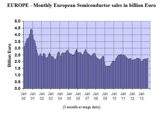 Globalement, les ventes européennes de semi-conducteurs en septembre 2013 se sont élevées à 2,964 milliards de dollars, soit 2,237 milliards d’euros. Sur les neuf premiers mois de l’année, elles ont augmenté de 2,6 % en dollars par rapport à la même période de l’année 2012, mais ont régressé de 0,1% en euros.