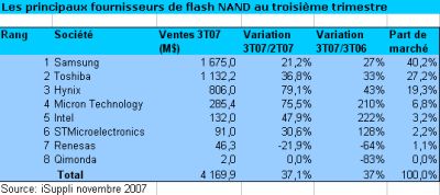 Contrastant avec la faiblesse du marché des mémoires Dram, les ventes mondiales de mémoires flash NAND ont, selon iSuppli, progressé de 37% en un an au troisième trimestre 2007, à près de