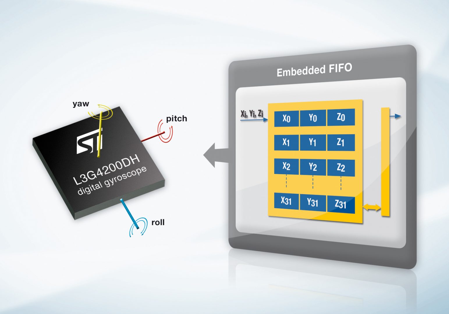 ST ajoute de la mémoire Eeprom à ses gyroscopes triaxiaux afin d’en baisser la consommation. STMicroelectronics lance le L3G4200DH, un capteur comprenant un gyroscope triaxial monolithique et un circuit spécifique à sortie numérique embarquant une mémoire Fifo de 32 échantillons (sur chaque axe). Ce qui évite la communication continue entre le processeur hôte et le capteur, lequel peut ainsi rester davantage de temps en mode veille et donc diminuer de manière significative la consommation du système. L’utilisateur peut en outre programmer la mémoire Fifo de telle sorte qu’une interruption soit lancée lorsqu’elle se trouve remplie à un certain niveau. Le L3G4200DH présente une pleine échelle programmable entre +/-250 °/s et +/-2000 °/s. Il est encapsulé dans un boîtier miniature de 4x4x1 mm et vendu 2,9 $ par quantités de 200 000 pièces.