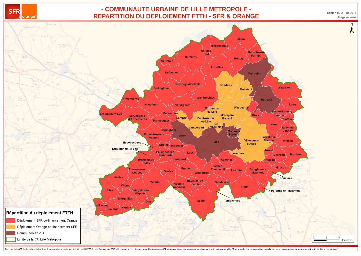 Les premières conventions “France Très Haut Débit” pour le déploiement du réseau FttH (Fiber to the Home ou fibre optique jusqu’au domicile) sur l’ensemble du territoire de Lille Métropole, ont également été signées. Ce déploiement de la fibre optique concerne l’ensemble des 85 communes de Lille Métropole : Orange dans 11 communes, SFR dans 70 communes et l’ensemble des opérateurs dont Orange et SFR dans les 4 communes les plus denses.Orange couvre ainsi 115 000 logements et plus de 45 000 logements sont déjà raccordables (disponibles à la commercialisation par un fournisseur d’accès Internet) dans 8 communes. SFR couvre de son côté 114 000 logements et plus de 34 000 logements sont déjà raccordables.