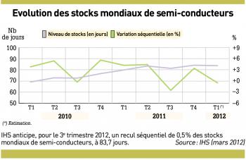 L a société d’études IHS annonce qu’au dernier trimestre de l’an passé, les stocks mondiaux de semi-conducteurs chez les fabricants de ces composants ont progressé de 3,4% par rapport au troisième trimestre. Au quatrième trimestre 2012, ces stocks représentaient 84,1 jours contre 81,3 jours au troisième trimestre et 83,4 jours au deuxième trimestre.