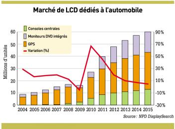 Selon NPD DisplaySearch, ce marché atteindrait plus de 60 millions d’unités dans 3 ans contre 40 millions en 2011. Le déploiement des véhicules électriques et hybrides devrait contribuer à cette accélération.