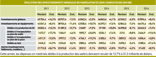 C ette année, les investissements en équipements de production de semi-conducteurs (production de wafers, encapsulation et test) devraient reculer de 11,6 % par rapport à 2011 à 38,9 milliards de dollars, selon la société d’études Gartner. Les dépenses en matériels dédiés à la production devraient diminuer de 12,7% à 31,3 milliards de dollars ; elles