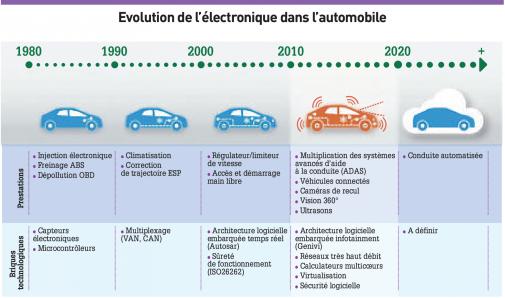Systèmes avancés d’assistance à la conduite, véhicule connecté à Internet, voiture communiquant avec ses semblables et/ou avec les infrastructures routières et urbaines, automobile autonome… Jamais l’industrie automobile n’a fait autant appel à l’électronique. Et cela ne fait que commencer, si l’on en croit les feuilles de route des ténors de l’automobile.