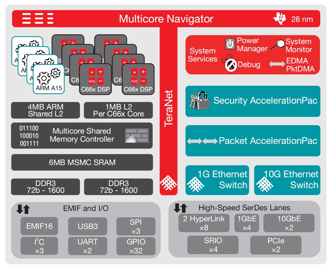 L’américain lance une puce mêlant quatre coeurs ARM Cortex-A15, huit coeurs DSP C66x et un commutateur Ethernet 10 Gbit/s.