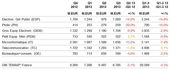 Le marché du petit électroménager (PEM) renoue, quant à lui, avec la croissance après un 2e trimestre négatif, notamment grâce aux mois d’aout et septembre. Le marché du gros électroménager (GEM) est en léger recul mais cette baisse est moindre que celle du premier et du deuxième trimestre. Le marché de la bureautique et des consommables enregistre un chiffre d’affaires de 599,4 millions d’euros sur ce troisième trimestre 2013. Avec un recul de 4,9%, le secteur affiche à nouveau une valeur en décroissance.