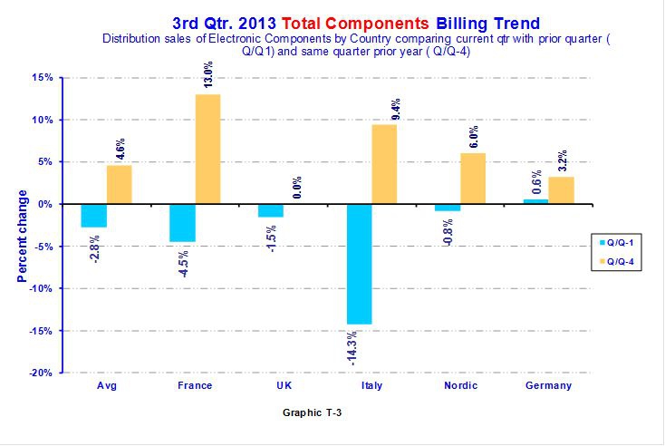 C’est le marché français de la distribution de composants qui affiche la plus forte croissance sur un an au 3ème trimestre 2013: +13% sur un an (-4,5% séquentiellement) à 148 M€. Le book-to-bill est de 0,98.