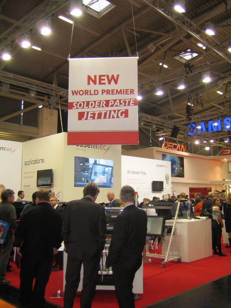 Essemtec a exposé lors de Productronica (Munich, du 12 au15 novembre 2013), une nouvelle machine alliant les fonctions de pose de composants CMS et de dépôt de crème à braser par impression à jet.