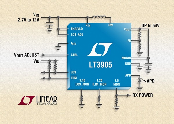 Le LT3905 de Linear Technology est un convertisseur DC-DC élévateur conçu pour polariser les diodes à avalanche APD (avalanche photodiode) insérées dans les récepteurs optiques. Un tel circuit a pour mission de contrôler le courant dans la photodiode, côté haut, sur une plage dynamique de cinq décades et avec une précision relative meilleure que 2 % entre 3 µA et 3 mA.
