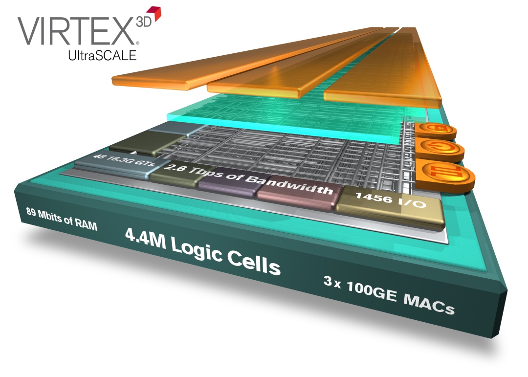 Xilinx développe le Virtex UltraScale VU440, un composant logique programmable embarquant l’équivalent de 50 millions de portes logiques de type Asic, plus du double du précédent Virtex-7 2000T de l’américain. Comme son prédécesseur, le VU440 est constitué de plusieurs puces reliées par vias traversants (TSV), à savoir trois puces de type FPGA montées sur une puce logique, l’ensemble tirant parti du process 3D 20 nm de TSMC. Il embarque également 89 Mbits de Ram, 2880 blocs DSP, 6 interfaces PCI Express et 3 ports Ethernet 100 Gbit/s. Son échantillonnage est prévu pour 2014.