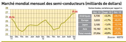 à l’échelle mondiale, les ventes de semi-conducteurs en octobre ont atteint 27,056 milliards de dollars, en hausse de 0,8% par rapport au mois précédent et en hausse de 7,2% par rapport au même mois en 2012. sur les 10 premiers mois de l’année, la progression atteint 3,9% au niveau mondial et 3,4% au niveau européen