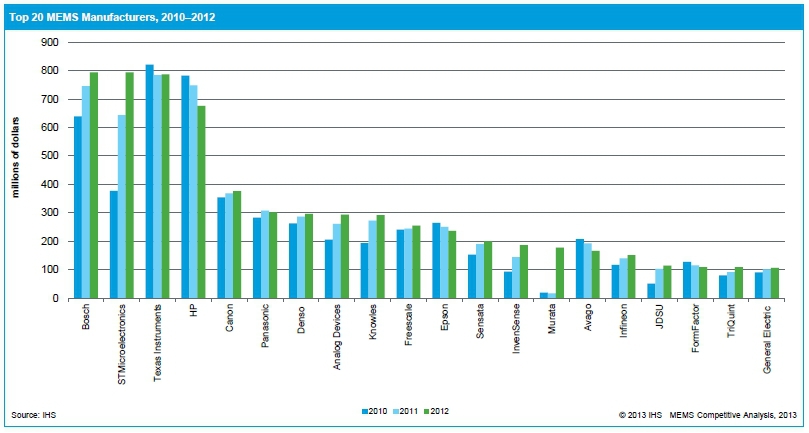 Autre particularité de ce marché, l’importance prise au fil des années par les fondeurs qui sont désormais une quarantaine parmi lesquelles TSMC et GlobalFoundries, ainsi que le leadership de deux grandes entreprises européennes, Bosch et STMicroelectronics, qui étaient au coude à coude en 2012 sur ce marché avec de l’ordre de 800 millions de dollars de chiffre d’affaires chacun pour leurs activités Mems. En 2013, Bosch devrait même franchir le cap du milliard du dollars dans ce domaine, alors que STMicroelectronics verrait ses ventes passer en dessous des 800 millions de dollars du fait de la perte d’un important client.