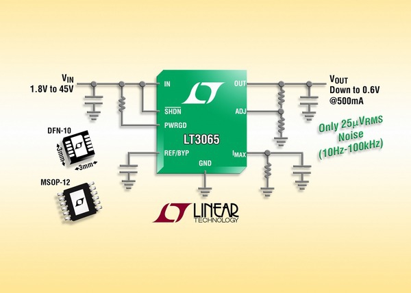 Supportant 45 V en entrée, le LT3065 de Linear Technology affiche une tension de bruit limitée à 25 µVeff dans la bande 10 Hz à 100 kHz.