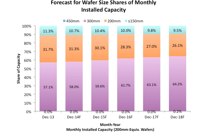 La capacité de production à partir de tranches de 200 mm de diamètre devrait progresser dans le monde jusqu’en 2015. Néanmoins, son pourcentage par rapport à la capacité totale de fabrication devrait, lui, reculer : entre décembre 2013 et décembre 2018, la capacité mensuelle de traitement des tranches de silicium de 200 mm de diamètre devrait passer de 31,7% de la capacité totale à 26,1%, selon IC Insight.