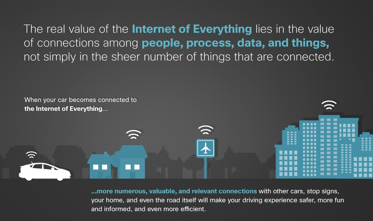 “L’Internet of Everything” (IoE) permet aux services publics de soutenir leur croissance et d’améliorer leurs prestations de services et leur productivité, de renforcer la sécurité publique et la protection de l’environnement. “L’Internet of Everything” peut ainsi générer un potentiel économique de 4 600 milliards de dollars d’ici moins de dix ans, selon Cisco dont l’étude repose sur 40 expérimentations conduites dans différentes agglomérations du monde.