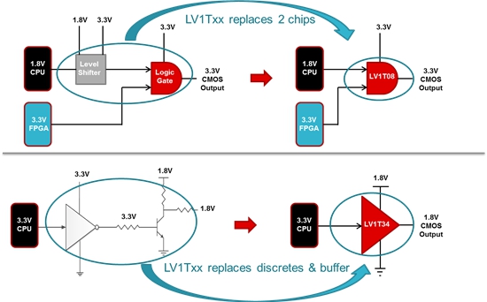 Texas Instruments présente les SN74LV1T, une famille de circuits logiques standard assurant à la fois des fonctions logiques classiques (Nand, And, Or, Nor, Xor, etc.) et le décalage de tension à partir d’une unique tension d’alimentation comprise entre 1,8 V et 5 V.