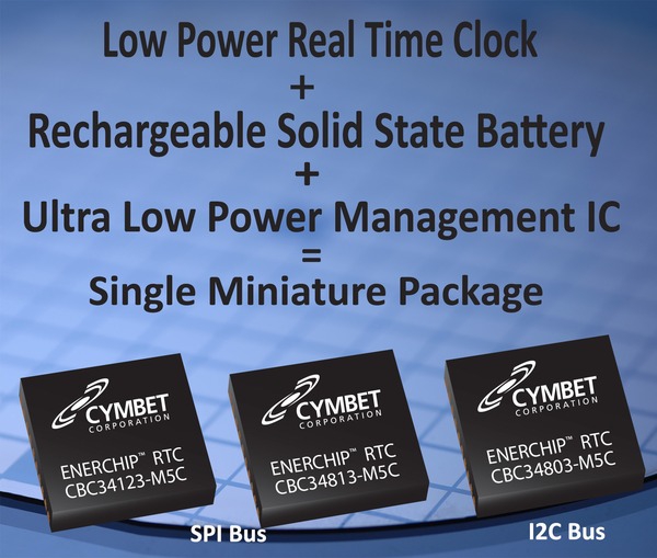 Avec EnerChip RTC, Cymbet introduit une famille de produits combinant une horloge temps réel (RTC, Real-Time Clock) à très faible consommation, une batterie état solide issue de la gamme EnerChip de la société et un circuit de gestion de l’énergie (PMIC). Le tout est embarqué dans un boîtier QFN-16, dont les dimensions sont de 5x5x1,4 mm seulement.