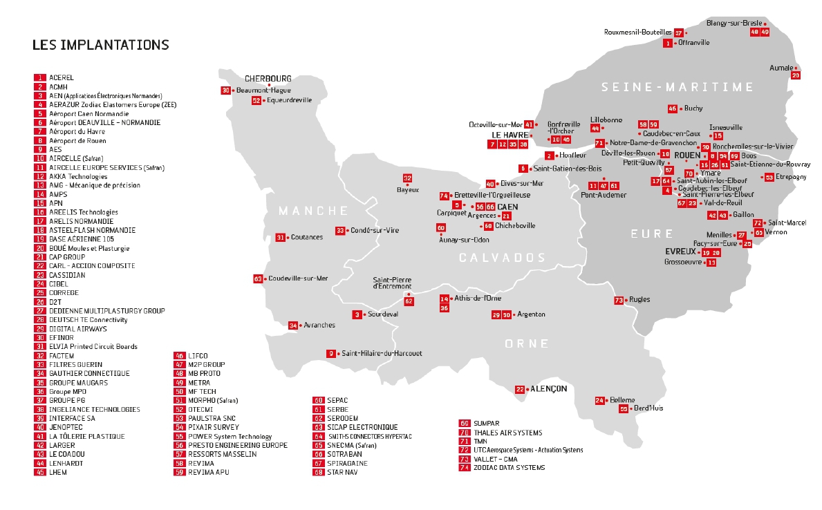 La filière NAE regroupe les constructeurs, les équipementiers, les principaux aéroports de la région, une base militaire ainsi que des laboratoires et des bureaux d’études. La majeure partie des entreprises de la filière NAE reste des PME de moins de 50 salariés (64% des membres). Une répartition homogène sur le territoire. Sur les 53 PME membres de la filière sur cette période, 22 sont implantées en Basse-Normandie (41%) et 31 en Haute-Normandie (59%).