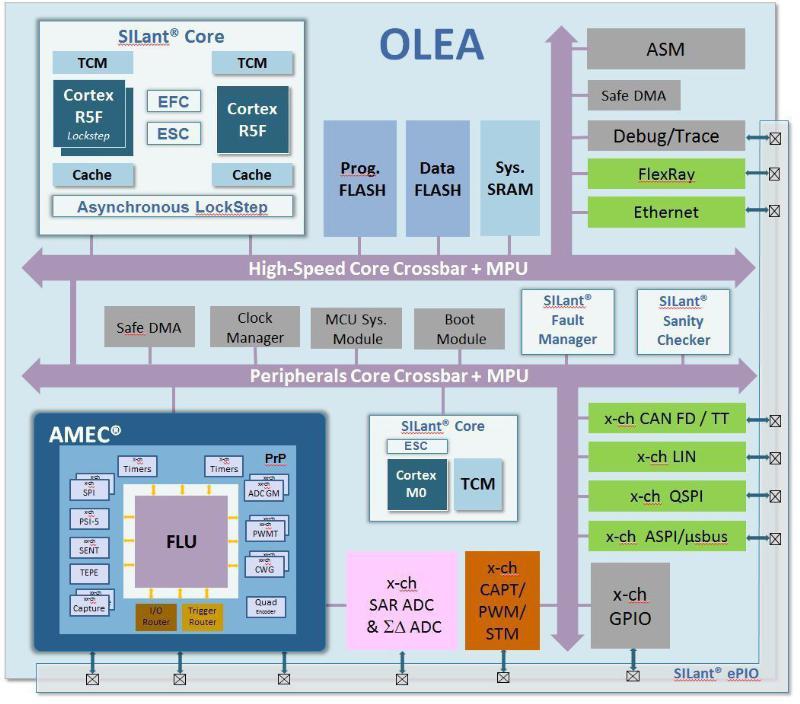 Ils embarquent jusqu’à 8Mo de flash, 512Ko de Ram, un convertisseur A/N SAR 2Méch./s à 64 canaux et un sigma-delta 300Kéch./s à 6 canaux, et des interfaces SPI, PSI-5, SENT, LIN, CAN, TT-CAN, FlexRay et Ethernet. Leur spécificité réside surtout dans des fonctions embarquées telles que AMEC (Advanced Motor Events Control) et SILant (Safety Integrity Level agent).