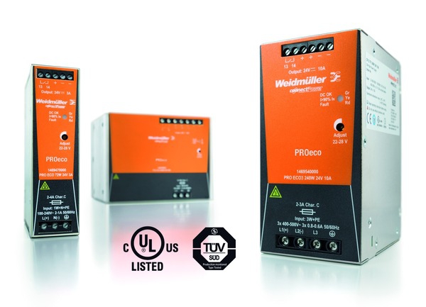 Offrant compacité, fiabilité et rendement élevé, les alimentations à découpage PROeco de Weidmüller sont déclinées en 9 modèles, 5 en monophasé et 4 en triphasé. D’un côté les Pro Eco (72 W 24 V/3 A, 120 W 24 V/5 A, 240 W 24 V/10 A, 480 W 24 V/20 A, 960 W 24 V/40 A), de l’autre les Pro Eco3 (120 W 24V/5A, 240 W 24V/10A, 480 W 24 V/20 A, 960 W 24 V/40 A).