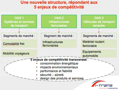 Le pôle de compétitivité i-Trans spécialisé dans les transports durables et la logistique vient de présenter son plan stratégique sur la période 2013-2018. L’ambition affichée : traduire l’innovation en produits et marchés d’avenir, en accompagnant les mutations technologiques du secteur des transports terrestres et la demande des marchés pour plus d’efficacité énergétique, de fiabilité, de sécurité, de performance et de design, vecteur d’attractivité.