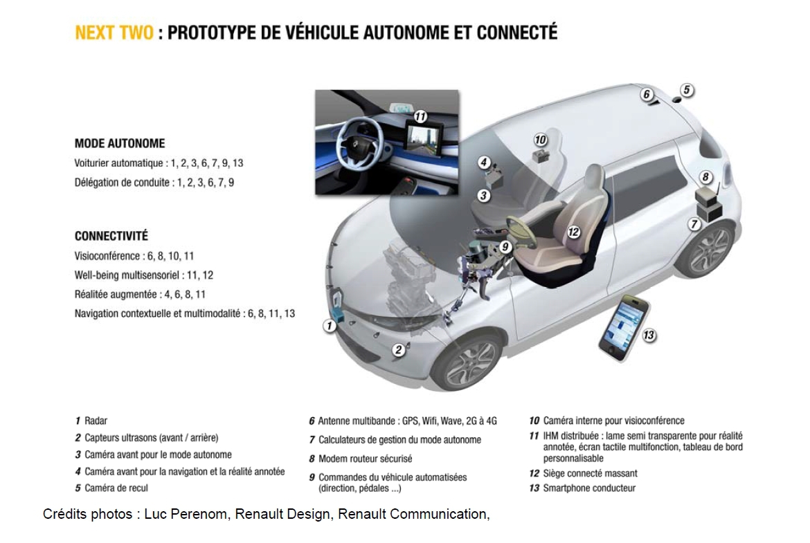 L’un des enjeux majeurs est de parvenir à des véhicules dont le prix soit abordable par le plus grand nombre tout en développant et utilisant des technologies très avancées. Carlos Ghosn a présenté le concept Next Two, prototype de véhicule autonome et connecté, basé sur le véhicule Renault Zoé, qui permet “la délégation de vitesse”, c’est-à-dire un pilotage autonome de la voiture lorsqu’elle se trouve en embouteillage à moins de 30 km/h, ainsi que le stationnement automatique.