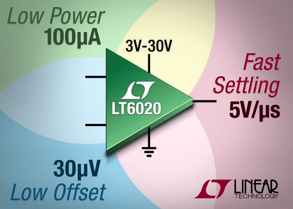 Le double amplificateur opérationnel LT6020 de Linear Technology associe un temps d’établissement très court (15µs, avec une stabilisation à 0,0015% près), une faible décalage de la tension d’entrée (30µV max.) avec une dérive limitée à 0,5µV/°C. Par ailleurs le slew rate est de 5V/µs, alors que la consommation est inférieure à 100µA, par amplificateur. En mode arrêt, celle-ci est de 3 µA (LT6020-1).