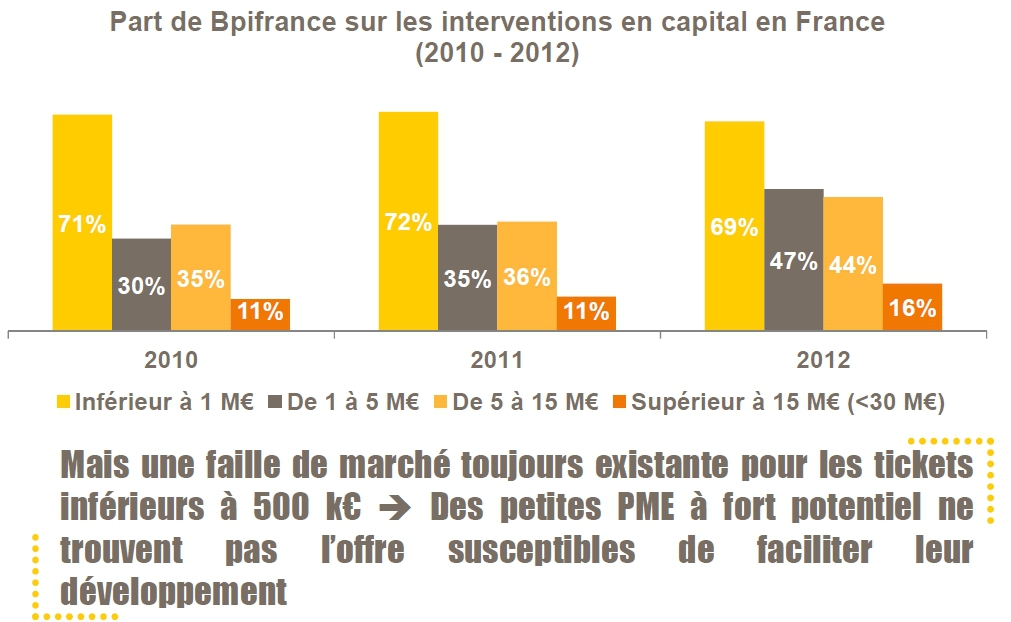 L’investissement implique en effet des coûts pour les fonds investisseurs (analyse financière, due diligence, appel à des conseils extérieurs) qui ne sont pas fonction de la taille du ticket. Le retour sur investissement peut ne pas couvrir ou trop peu couvrir ces coûts importants pour les tickets de 150 000 à 500 000 euros. C’est pourquoi le marché du capital investissement ne répond que trop partiellement à ce besoin.