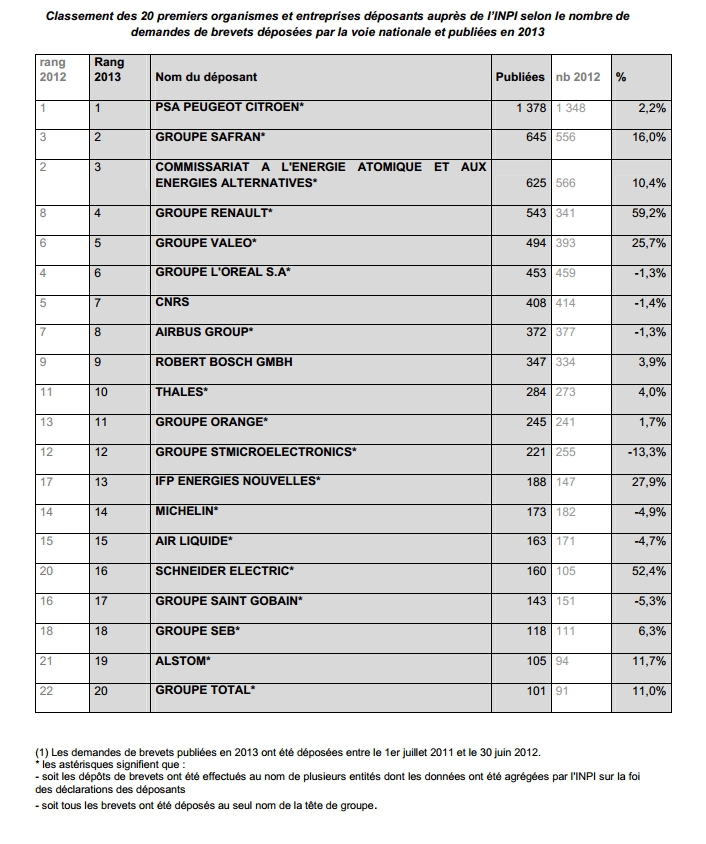 Parmi les vingt premiers déposants de brevets publiés en 2013, figurent les principaux groupes industriels français, mais aussi 3 organismes de recherche et 2 entreprises étrangères, révèle l’INPI (Institut national de la propriété industrielle).