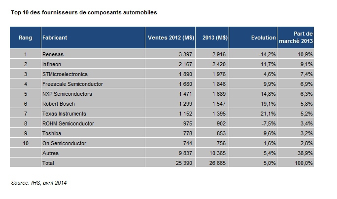 D’après une étude publiée par la société d’analyse IHS Technology, Renesas Electronics s’est maintenu en 2013 à la tête des ventes de circuits pour l’automobile avec 11% de ce marché. Avec 2,9 milliards de dollars de chiffre d’affaires, le japonais devance assez largement Infineon Technologies (2,4 milliards de dollars), STMicroelectronics (1,98 milliard de dollars) et Freescale (1,84 milliard de dollars). Renesas réalise notamment 40% des ventes de microcontrôleurs automobiles, loin devant Freescale (22%). Dans son ensemble, le marché des composants automobiles a crû de 5% l’an passé.