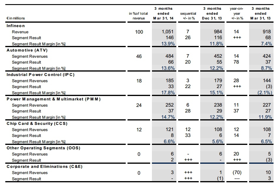 Infineon Technologies achève son deuxième trimestre fiscal 2014 sur un chiffre d’affaires de 1,051 milliard d’euros, en hausse séquentielle de 7%, pour un bénéfice net de 124M€. Toutes les familles de produits voient leurs ventes orientées à la hausse, qu’il s’agisse de l’automobile (+7%), l’industrie (+3%), la gestion de puissance (+6%) ou les cartes à puce (+12%). Pour le prochain trimestre, Infineon s’attend à une progression de 4 à 8% de ses ventes.