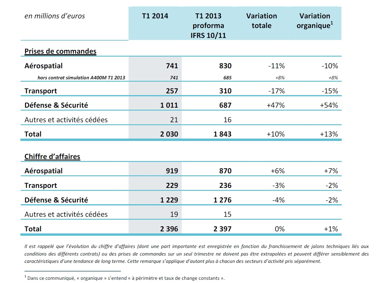 Les prises de commandes dans les marchés émergents devraient continuer à augmenter, avec une croissance attendue à deux chiffres sur l’ensemble de cette année, permettant de compenser la baisse des commandes attendue dans les pays matures, notamment en défense. Le chiffre d’affaires devrait demeurer stable en 2014.