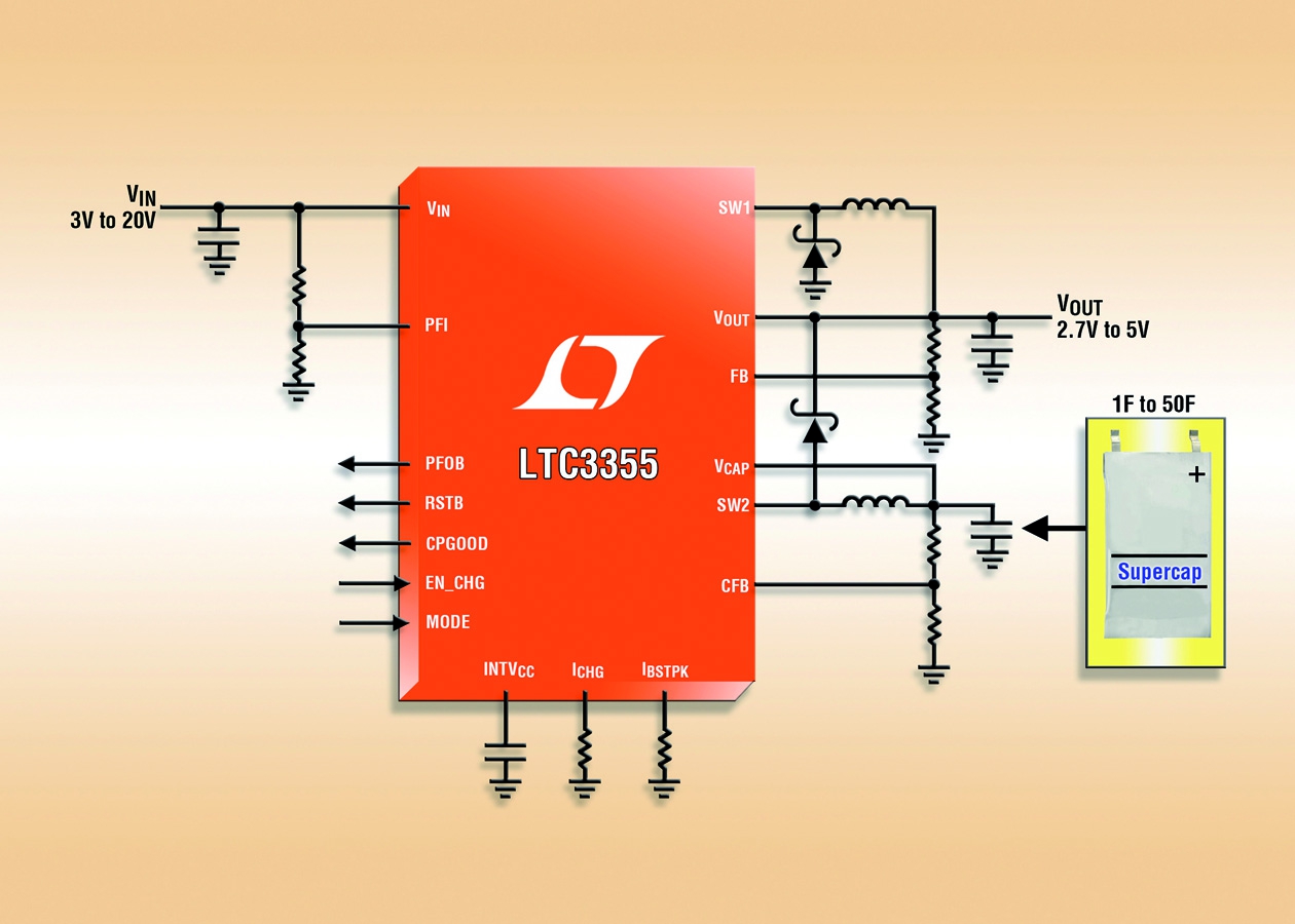 Avec le LTC3355, Linear Technology introduit un système de conversion DC-DC garantissant le maintien de la tension de sortie en cas de perte soudaine et temporaire de la source d’alimentation. Pour ce faire, outre la fourniture du courant demandé par la charge, le circuit prend à son compte la charge d’un supercondensateur (de 1F à 50F). L’énergie emmagasinée par ce dernier est alors mise à profit pour maintenir, en cas de coupure, le potentiel de sortie à un niveau suffisant par l’intermédiaire d’un régulateur élévateur auxiliaire. Le basculement vers cette alimentation de secours s’effectue de façon automatique.