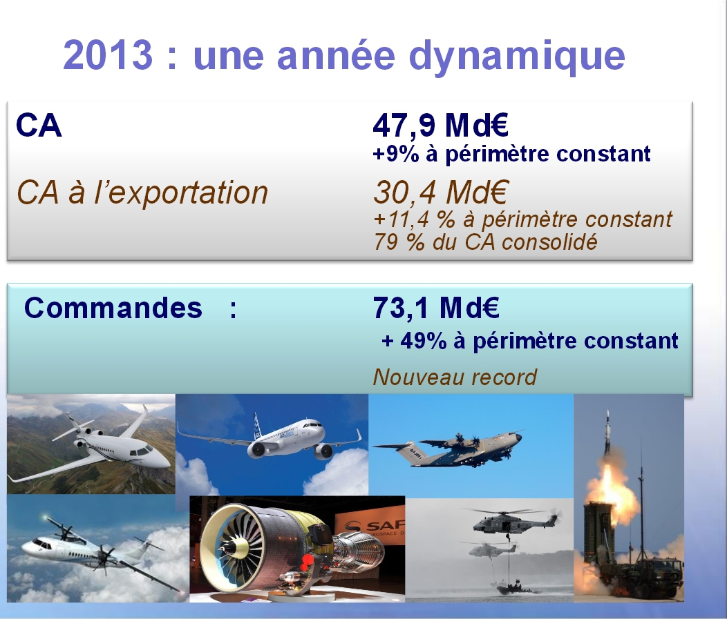 En termes de commandes, 2013 a été une année record avec 73,1 milliards d’euros, soit une progression de 49% par rapport à 2012, principalement grâce au secteur civil qui représente 84% des commandes reçues. Le carnet de commandes global de la profession représente entre 5 à 6 années de production. « Ces performances permettent à la profession de dégager, une fois de plus, le premier solde excédentaire de la balance commerciale française en 2013 avec +22 milliards d’euros » a souligné Marwan Lahoud.