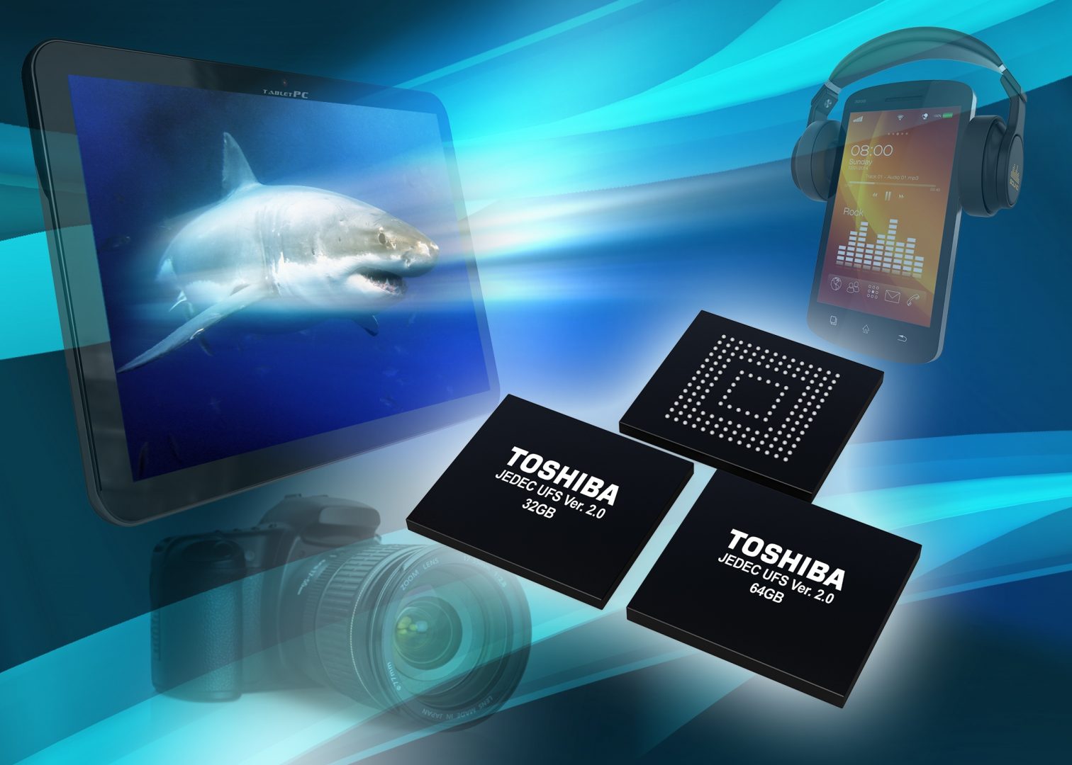 Toshiba échantillonne des modules de mémoires flash Nand de 32 et 64 Go conformes à la norme JEDEC UFS v2.0 et offrant une vitesse de 650 Mo/s en lecture et de 180 Mo/s en écriture.
