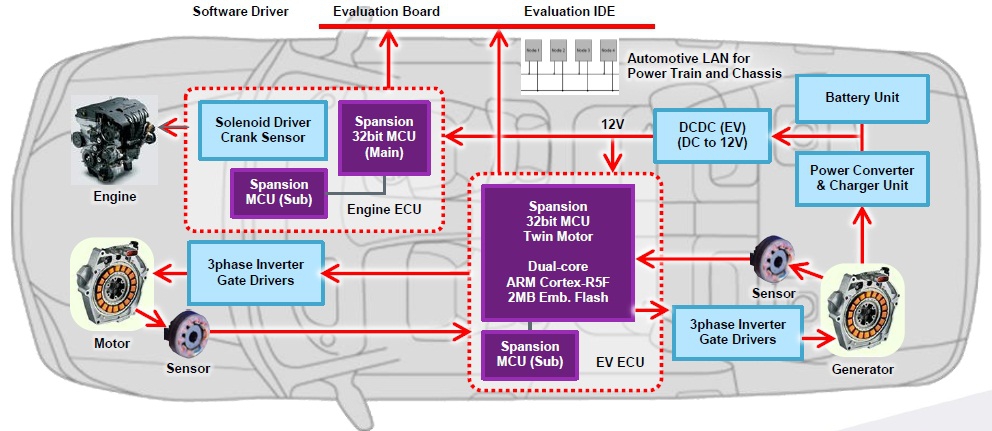 Spansion inaugure Traveo, nouvelle famille de microcontrôleurs basés sur des coeurs 32 bits Cortex-R5 et destinés principalement aux applications automobiles. Référencés MB9D560, les premiers membres de cette famille héritée du rachat des microcontrôleurs de Fujitsu embarquent deux coeurs cadencés à 200MHz et équipés chacun d’une unité de calcul en virgule flottante délivrant 1,66DMips/MHz, et jusqu’à 2Mo de mémoire flash.