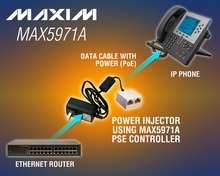 Afin de diminuer coût et encombrement sur la carte, le MAX5971A de Maxim intègre un Mosfet de 0,5 Ohm et une résistance de détection. Pour les applications Power over Ethernet Plus (PoE+), Maxim introduit un contrôleur PSE (power sourcing equipment) simple port compatible avec les normes IEEE 802.3af et IEEE 802.3at.