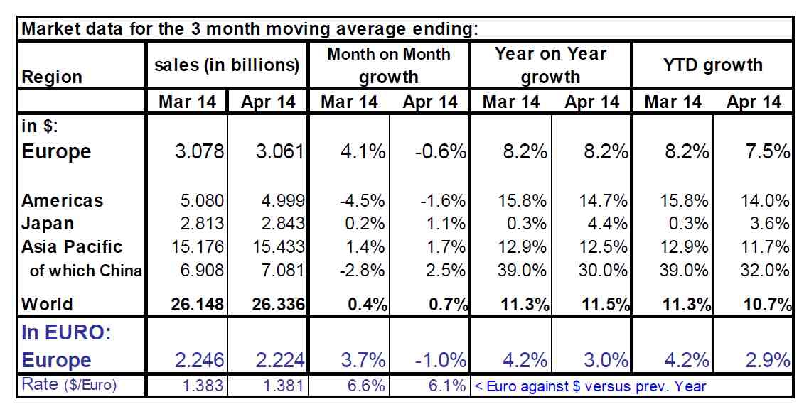Le taux de change euro-dollar a eu un effet notable sur la croissance du marché lorsque celui-ci est exprimée en euros. En effet, les ventes européennes de semi-conducteurs en euros ont progressé de 3% par rapport à avril 2013, soit un déficit de plus de 5 points de croissance par rapport au calcul effectué en dollars (+8,2%) !