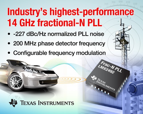 Avec le LMX2492, Texas Instruments introduit un synthétiseur de fréquence fractionnaire, nouveau membre de la famille PLLatinum. Cette PLL avec VCO externe couvre une large bande (fréquence de sortie entre 500MHz et 14GHz). Selon la société, par rapport à son concurrent le plus proche, le circuit affiche des performances en termes de bruit de phase meilleures de 6dB. En valeur normalisée, le bruit de phase est ainsi de -227dBc/Hz.